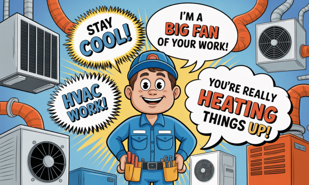 This collection of HVAC puns is simple and family-friendly. You can use them for captions, school fun, or quick laughs at home. Get ready for humor thatβs fresh, breezy, and full of cool one-liners.