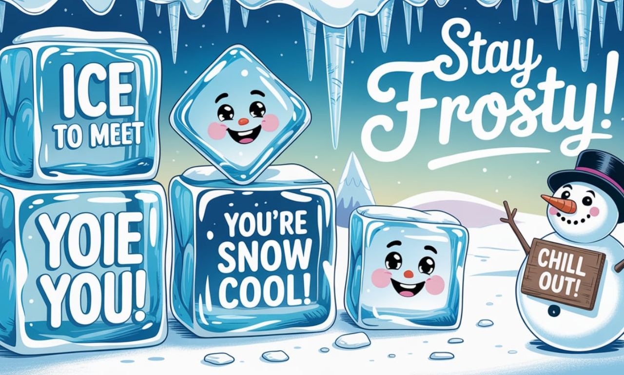 Each pun captures the spirit of frozen fun β short, clever, and easy to share. Whether you want ice-themed names like Frost Queen, Glacier Glow, or Chillzilla, or funny phrases like Freeze the day, Stay frosty, and Ice to meet you, this list has all the frozen wit youβll ever need. Itβs a blend of ice puns, cool captions, and frosty sayings that sparkle with humor and creativity.